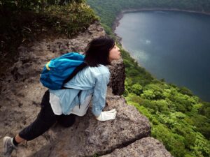 大浪の池の外輪山尾根から断崖絶壁に身を乗り出すも、思
